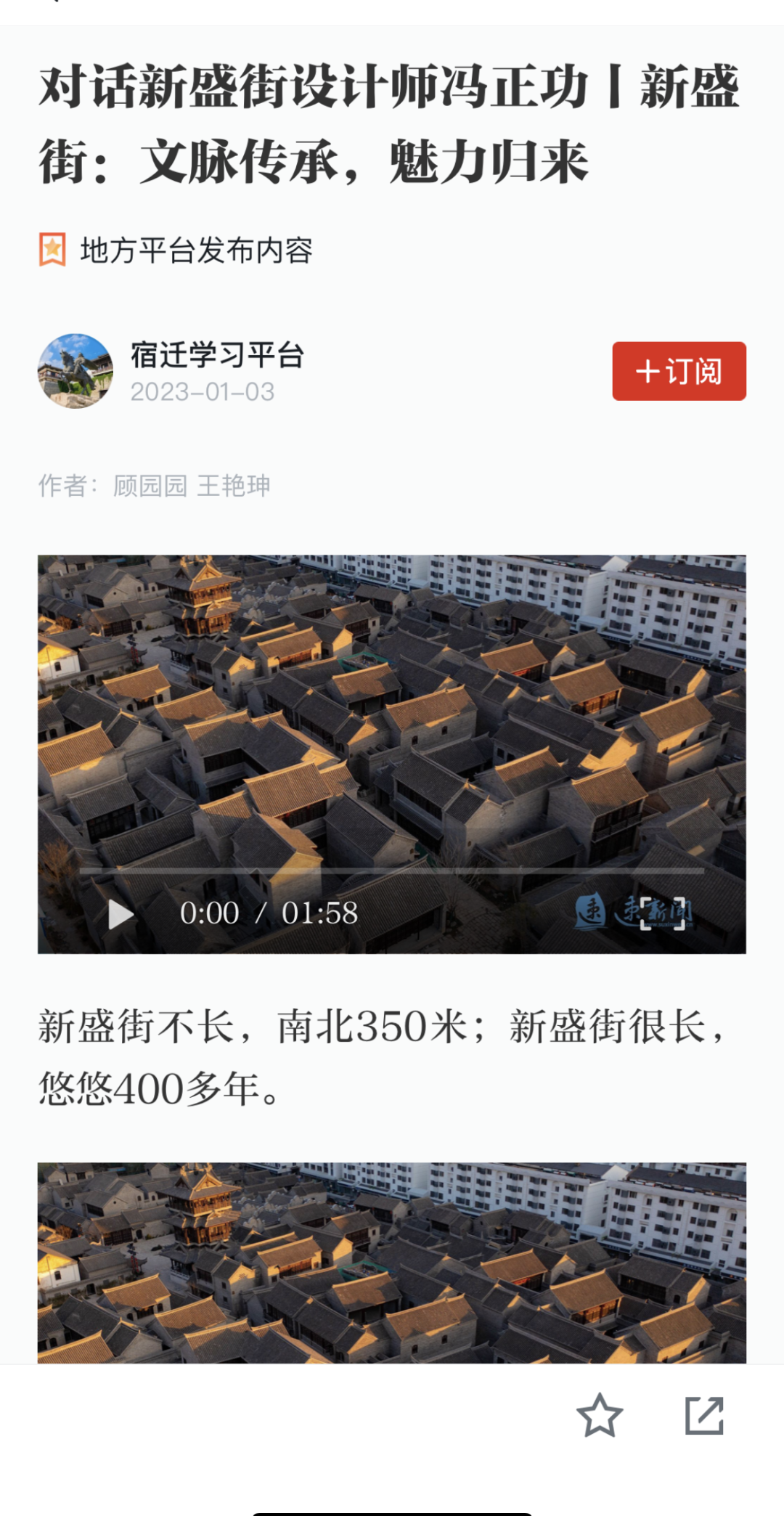近日,“學(xué)習強國”平臺發(fā)布《對話(huà)新盛街設計師馮正功丨新盛街:文脈傳承,魅力歸來(lái)》文章(來(lái)源:宿遷日報社)