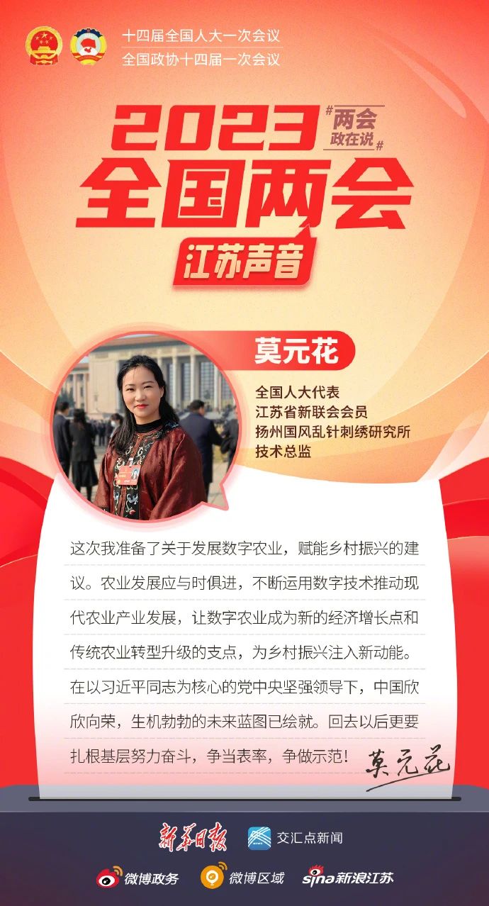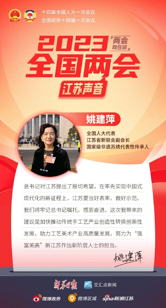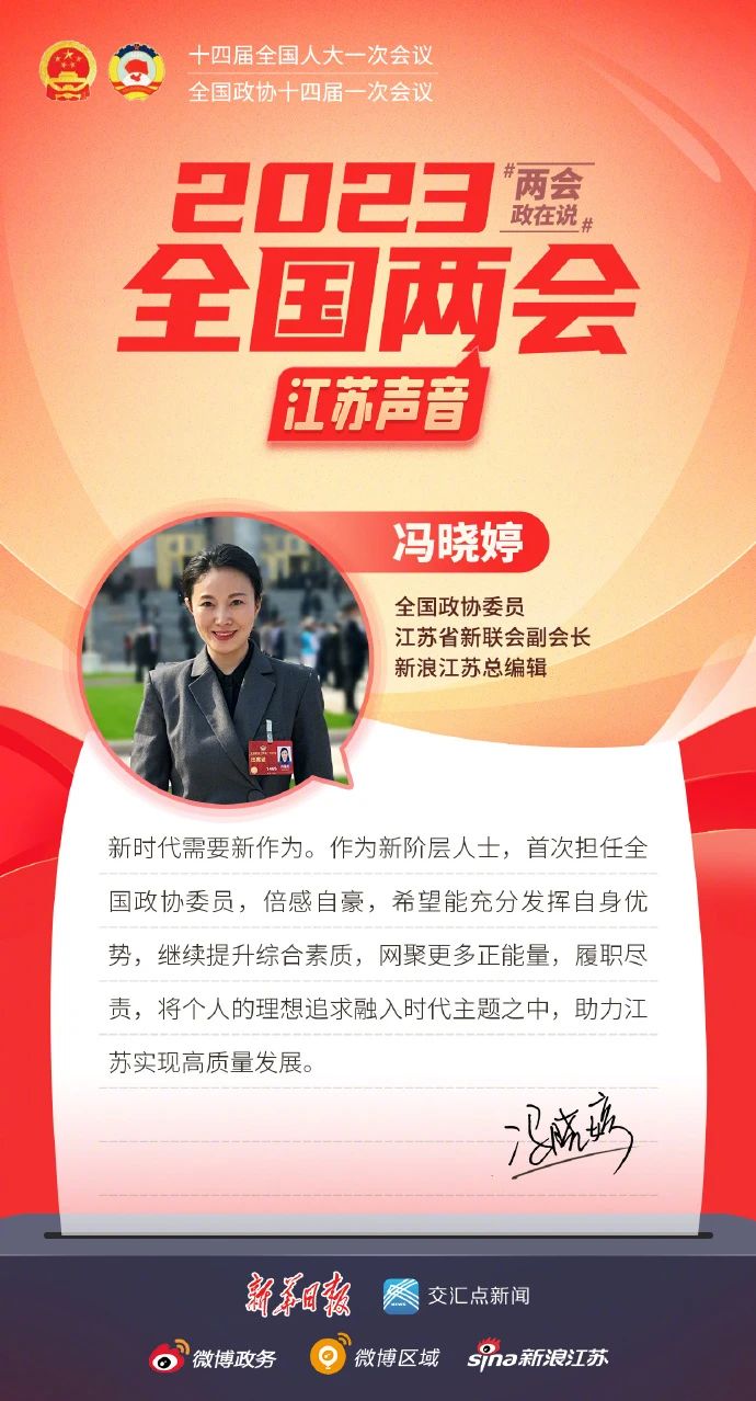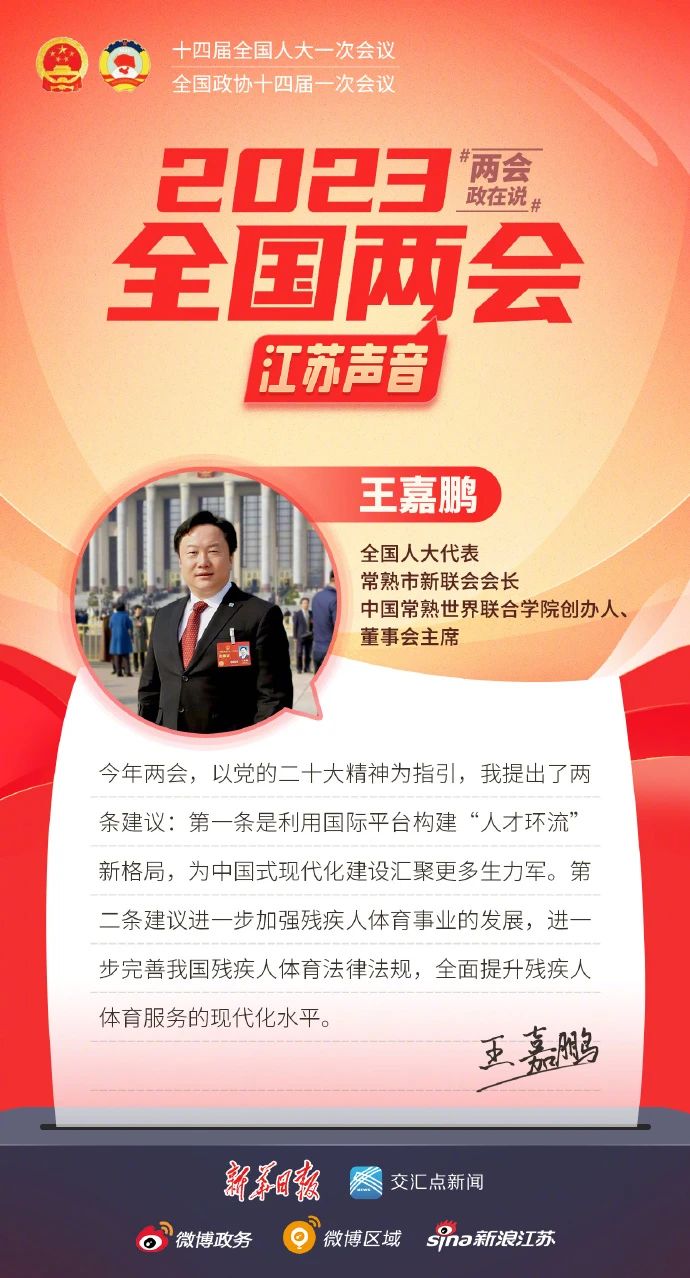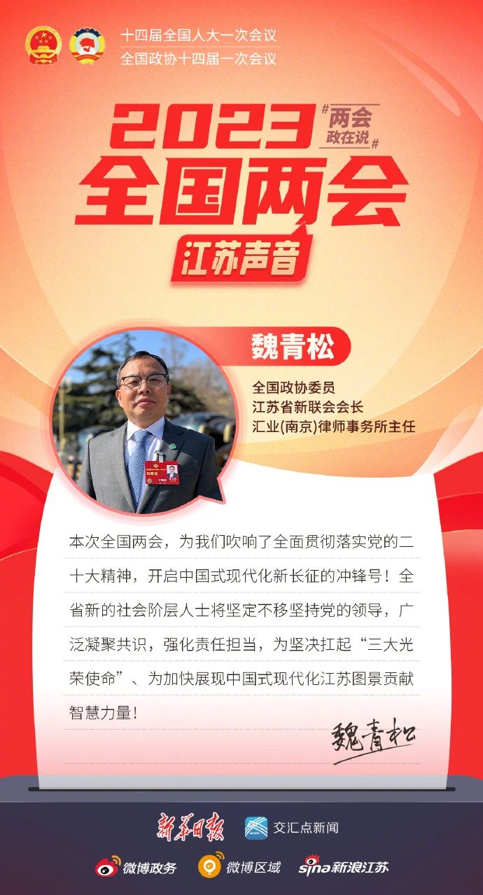 近日,江蘇省新的社會(huì )階層人士聯(lián)誼會(huì )微信公眾號“蘇說(shuō)新力量”報道了全國人大代表姚建萍、全國人大代表張謹、全國人大代表王嘉鵬、全國人大代表莫元花、全國人大代表王春香、全國人大代表李葉紅、全國政協(xié)委員魏青松、全國政協(xié)委員馮曉婷帶來(lái)的兩會(huì )建議與對未來(lái)發(fā)展的美好展望。